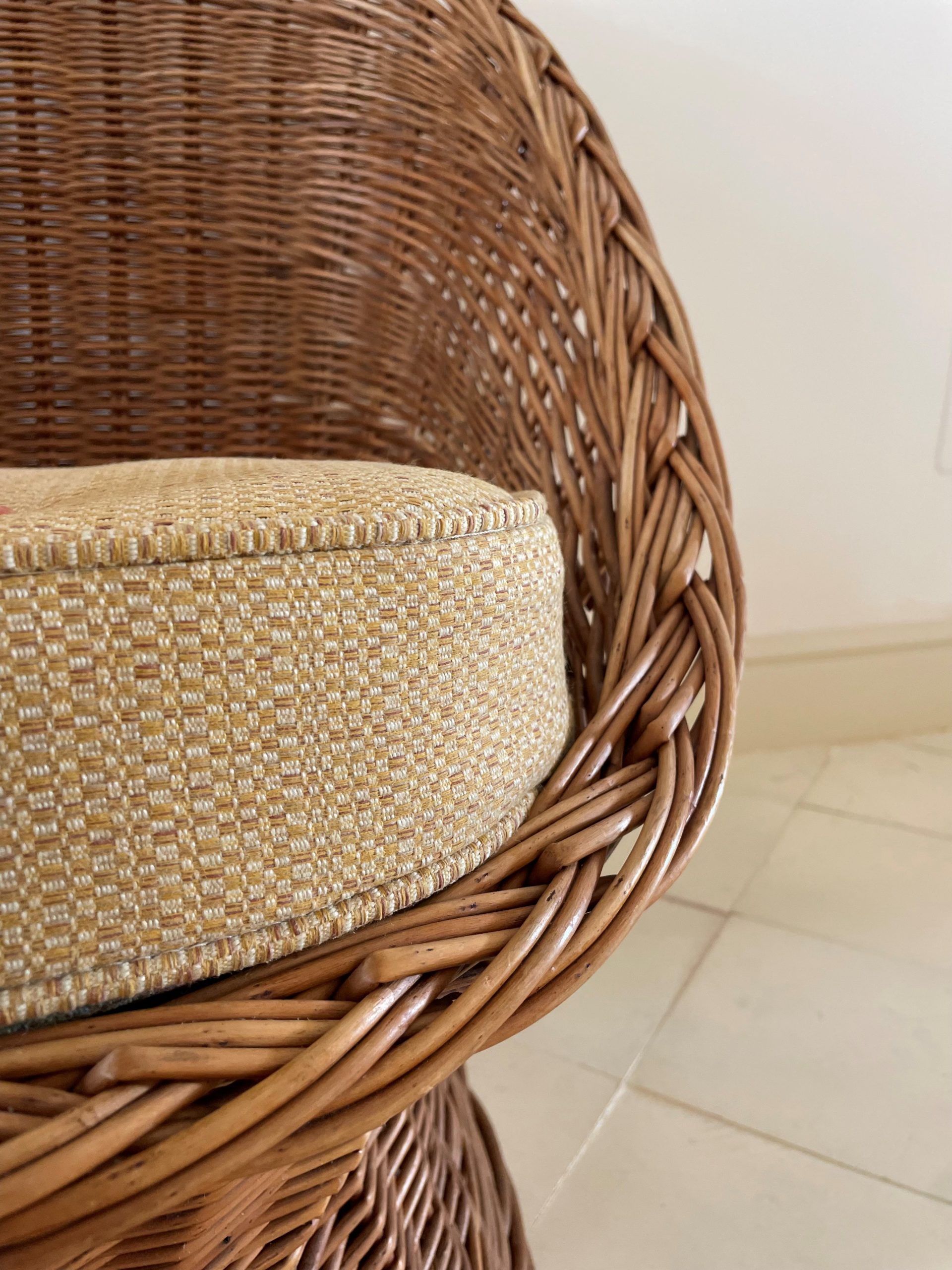 A pair of woven rattan armchairs with made-to-measure yellow cushions. France, mid 20th Century. 74cm high by 70cm deep and 69cm wide. Seat hight: 41cm
