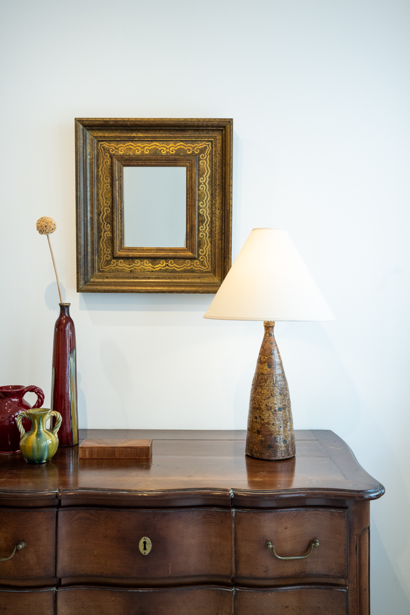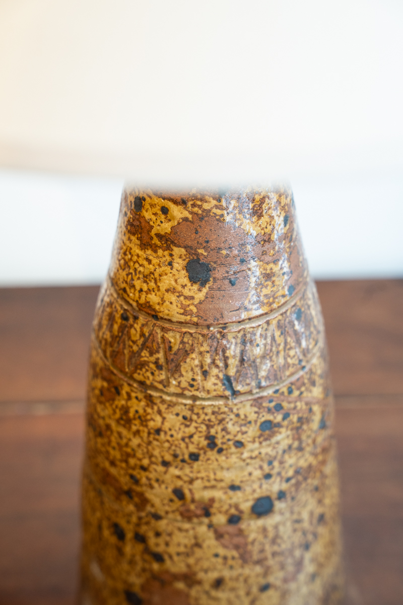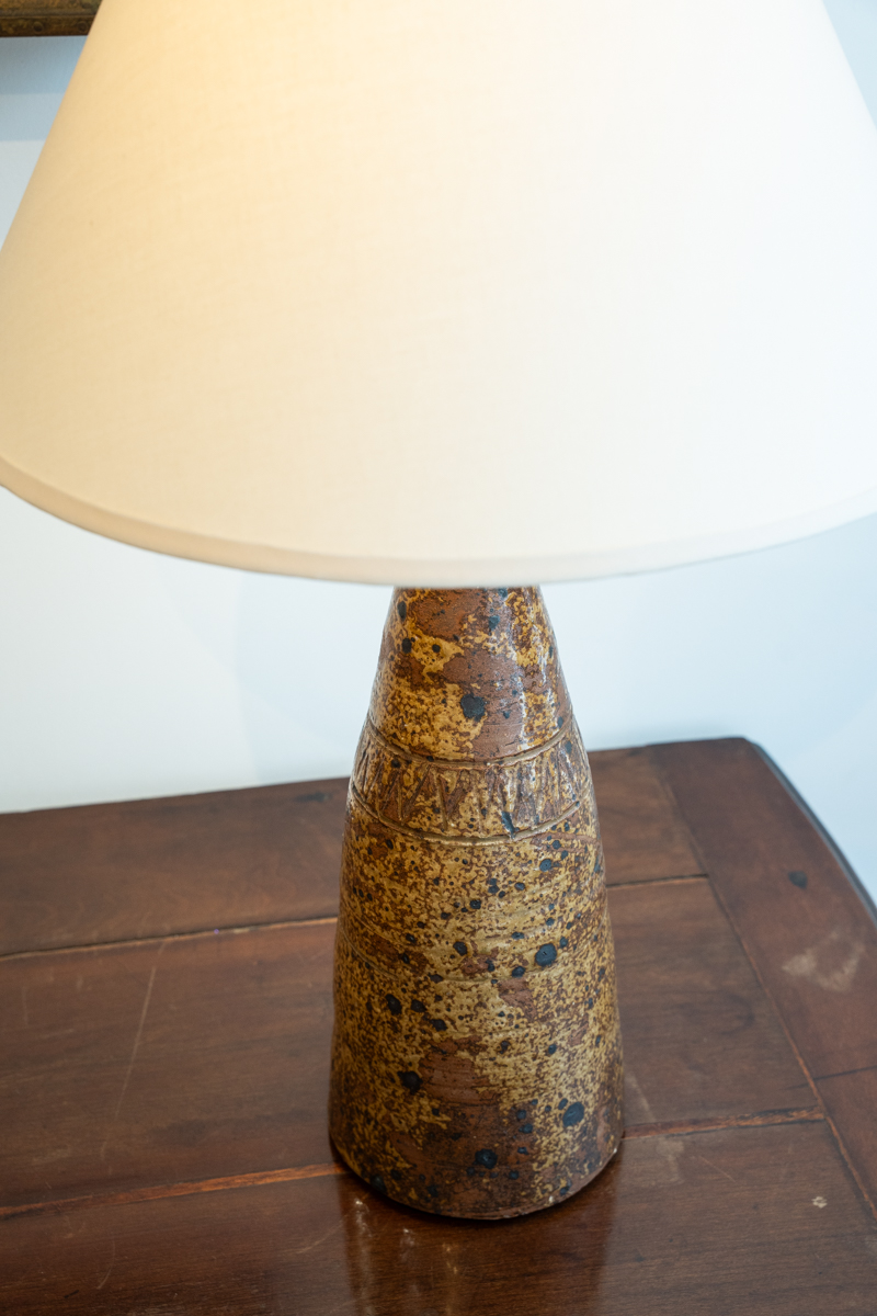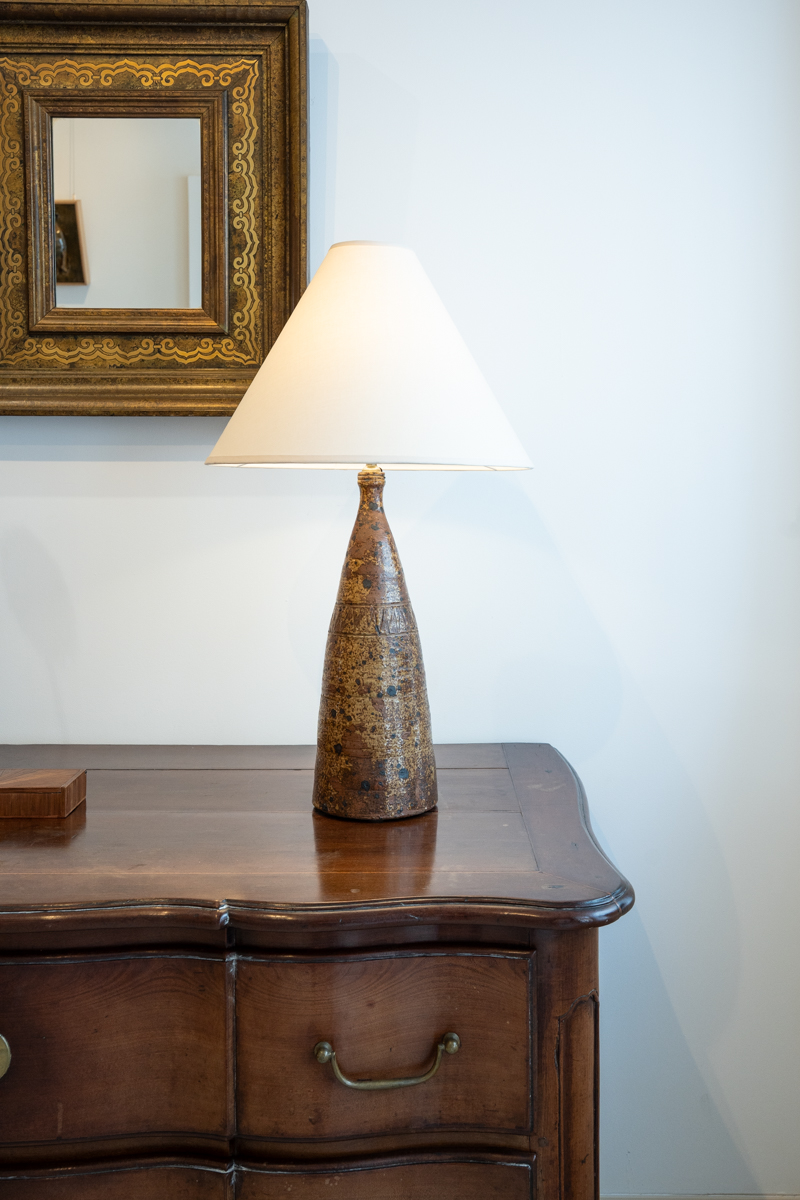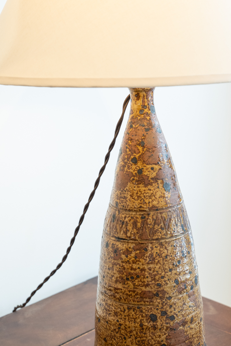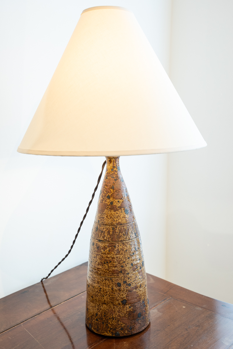 Guy Baudat en La Borne. Francia, circa 1960. 69 cm de alto y 40 cm de diámetro. Base de la lámpara sin pantalla, 45 cm de alto.